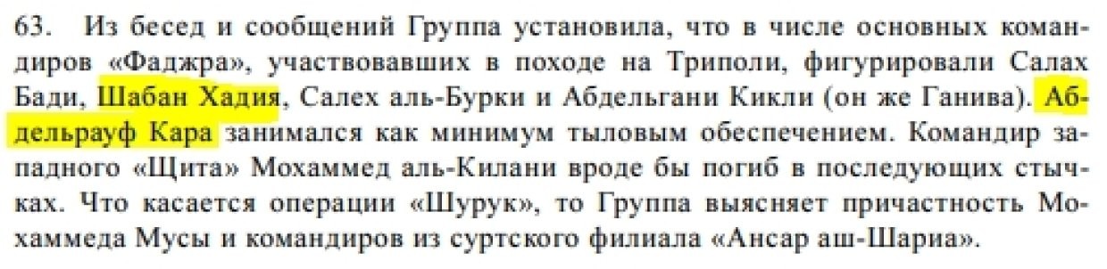 Экспертная группа ООН установила, что Шабан Хадиа выступал в роли одного из основных командиров штаба «Фаджра». Там же находился и Абдэльрауф Кара, ныне полевой командир группировки RADA, незаконно удерживающей двух российских социологов ФЗНЦ в подконтрольной ей тюрьме «Митига».