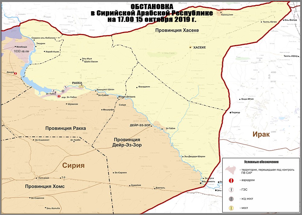 Карта описывает ситуацию на пять вечера 15 октября. На ней под контролем сирийской армии находятся Манбидж, окрестности Табки, в том числе аэродром, три моста (один из них железнодорожный) и две ГЭС.