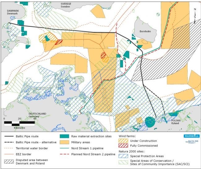Специфика Baltic pipe состоит в том, что он будет проходить через уже действующий «Северный поток» и будущий «Северный поток-2». В материалах Energinet и Gas-system, поданных датскому регулятору, говорится, что на месте пересечения для обеспечения безопасности будут использоваться бетонные «матрасы» и каменная кладка и конструкции официально согласуют с собственниками обоих «Северных потоков».