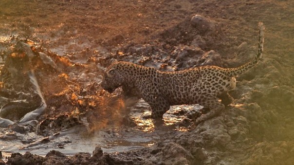 Туристы проявили терпение: вероятность того, что пятнистый кот вернется за легкой добычей, была весьма высока. Так и оказалось: уже спустя десять минут леопард подошел к самой кромке озерца, а затем попытался схватить одну из рыб. Барбусы забились в воде, обдав рыбака целым фонтаном грязных брызг, но тот так просто не сдался, на мгновение «нырнул» головой в середину лужи и выпрямился уже с добычей в зубах.