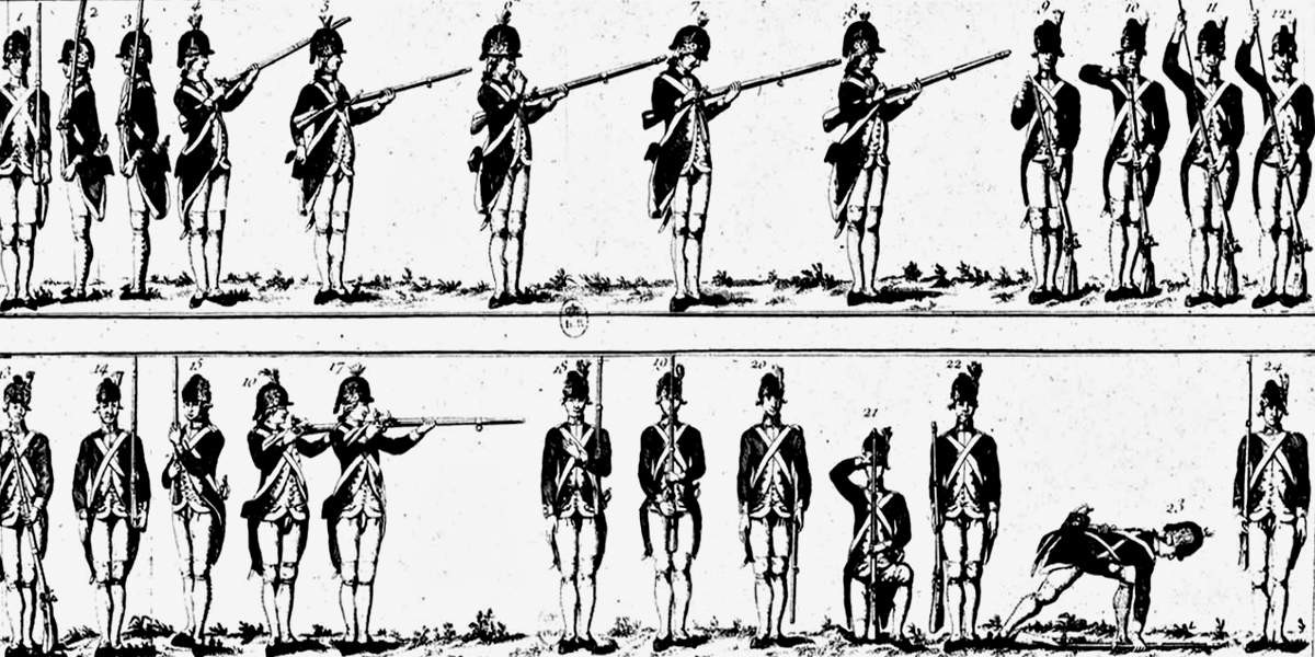 Заряжание мушкета XVIII века происходило в 12 приёмов. Все они чётко регламентировали действия солдата — от изготовки ружья к выстрелу до нажатия спускового крючка.