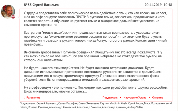 "Десятилетиями латышские правительства одно за другим ухудшали нашу с вами жизнь в Латвии с целью выдавить нас из страны, а оставшихся ассимилировать. Они делали это упорно и последовательно не просто так, а потому что этого желал латышский избиратель - он и сейчас этого желает, кстати.