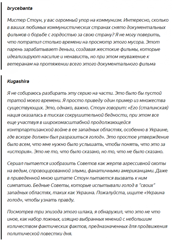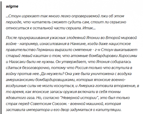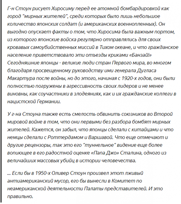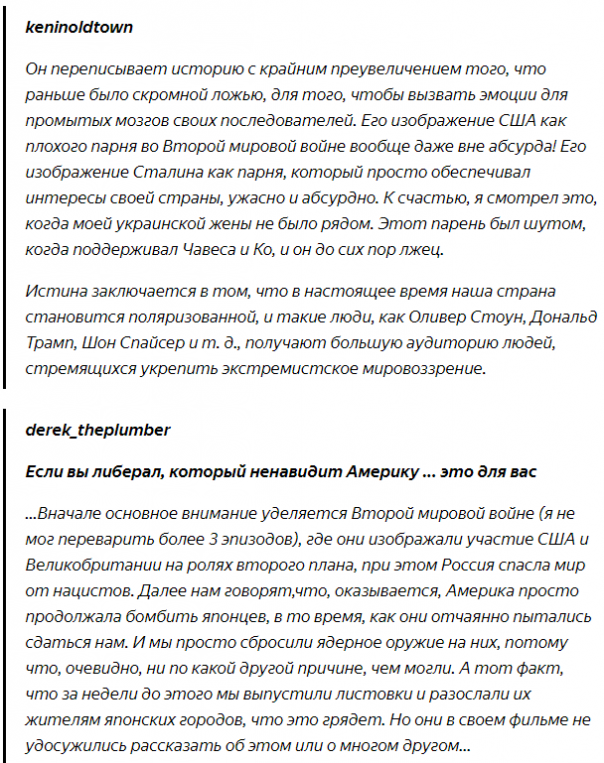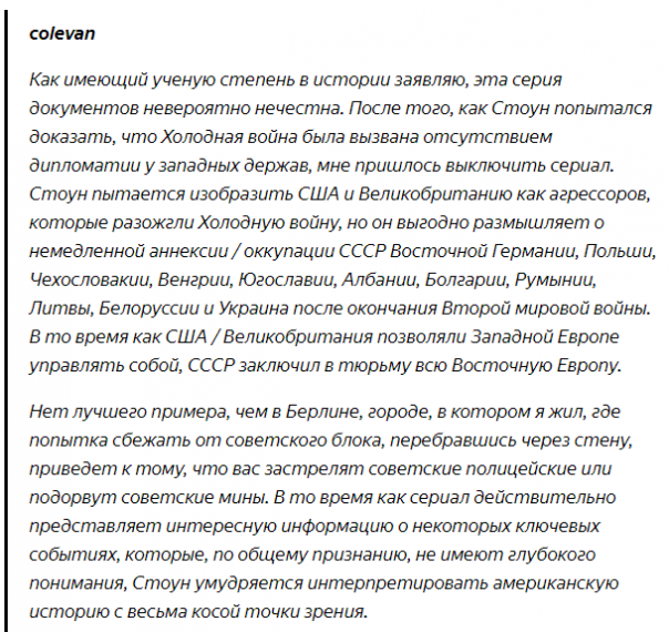 - Сталин у него тиран, а вот "мистер Горби" наоборот - мудрый и дальновидный политик... В тоже время в сериале Стоун прямо говорит, что истинной причиной высадки Союзников во Франции в 1944 году было не позволить Советскому Союзу самостоятельно закончить войну.