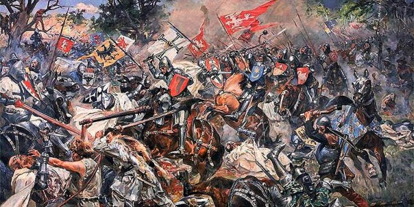 Только представьте! Два войска стояли друг напротив друга. Первую линию и тут и там составляли рыцари, расположившиеся в шеренге с интервалами, равными длине копья. За ними встали их оруженосцы и тяжеловооружённые всадники. Сшибку предвосхитил поединок — на поляне, зажатой между двумя армиями, сошлись польский рыцарь Ян Шицкий и силезец на службе Ордена по имени Конрад Нимпш. Поляк сумел выбить из седла своего визави, и этим ободрил соотечественников.