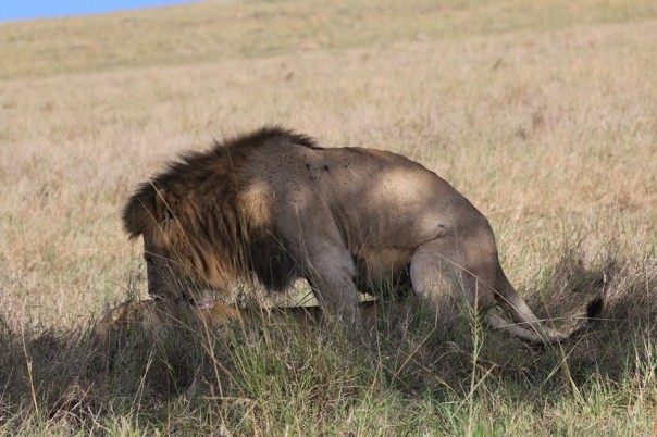 Удача была на стороне кошки: она заметила антилопу, которая беззаботно паслась, не обращая внимания ни на людей, наблюдающих с дороги, ни на подкрадывающуюся хищницу. Оказавшись на максимально близком расстоянии, львица прыгнула и тут же повалила жертву на землю. Борьба была недолгой, и охотница вскоре смогла утолить свой голод.