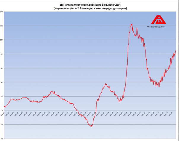 8. Месячный дефицит бюджета США составил в среднем $85.2 ярдов, вырос за год на 15.8%. Это абсолютный рекорд с января 2013 года: