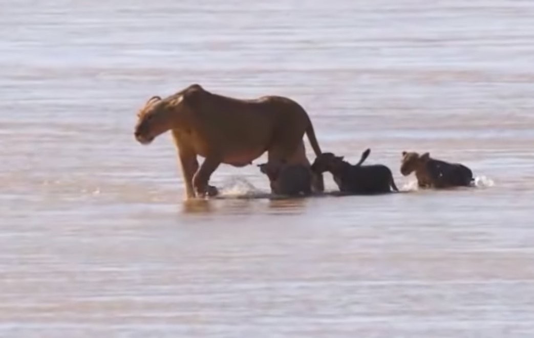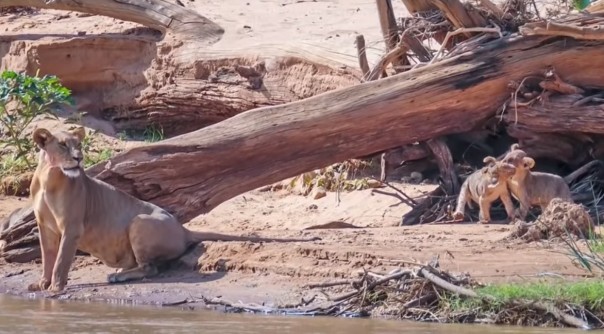 Она выбрала мелководье, но даже там один львенок споткнулся и начал уходить под воду. Однако львица моментально вытащила его, а затем так же, схватив за загривок, помогла выйти на сушу второму. Третий оказался более самостоятельным и справился сам.
