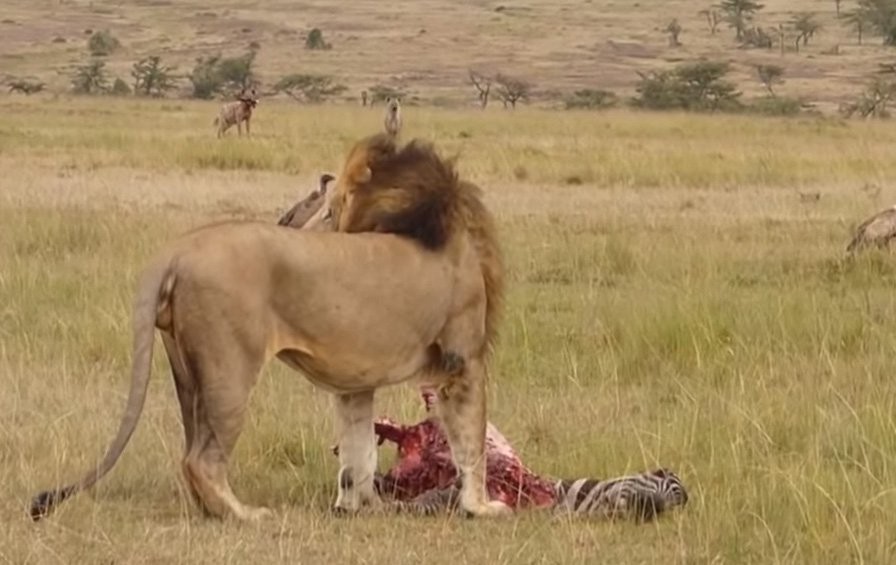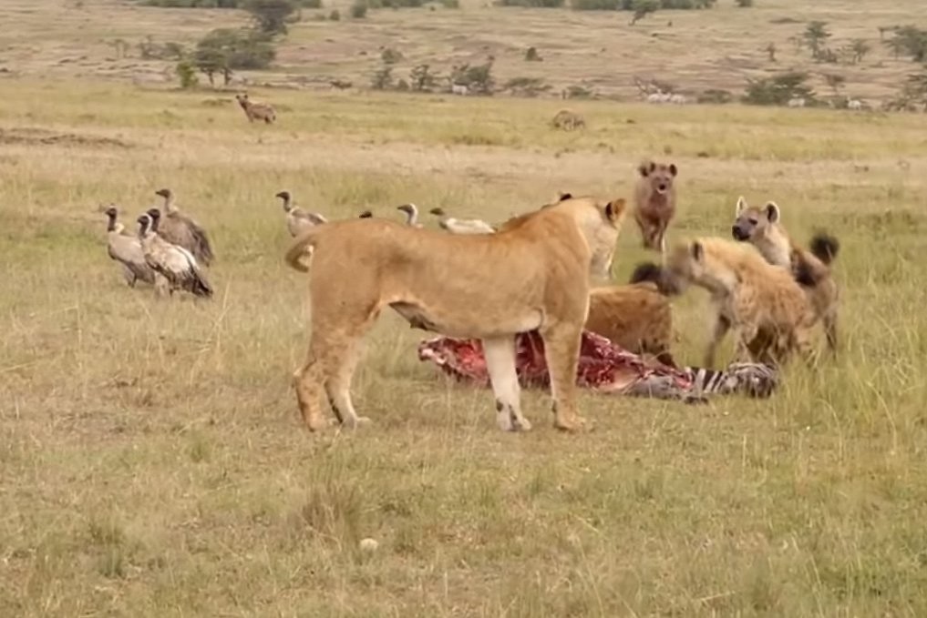 Однако в данном случае львица переоценила свои силы: гиен было несколько, они были настроены биться за свой трофей до конца, и кошка отступила. Но вскоре к «обиженной» львице присоединился взрослый самец, с угрожающим видом рысью направившийся к гиенам. Одно его появление обратило зищников в бегство. После этого царь зверей и две подруги из его прайда спокойно насладились трапезой.