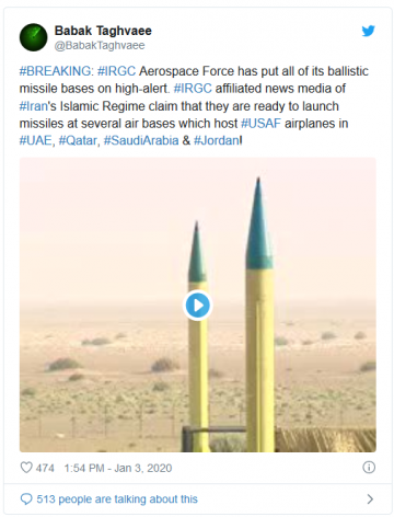 Согласно данным информационных источников, Иран начал осуществлять подготовку к пуску баллистических ракет. Об этом свидетельствует аномальная активность на пусковых площадках, а также нахождение в воздушном пространстве страны большого количества истребителей, что может свидетельствовать о том, что в течение ближайших 24 часов Иран может нанести масштабный удар по расположению американских военных баз и объектов на территории всего Ближнего Востока.
