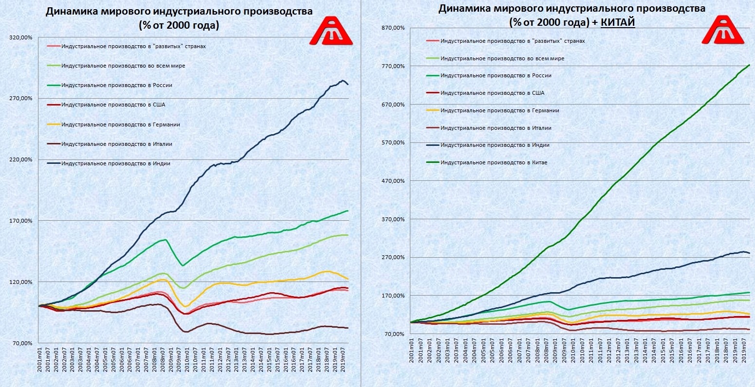 12. Индустриальное производство в процентах от уровня 2000 года (два графика отличаются исключительно наличием Китая и связанным с этим масштабированием):