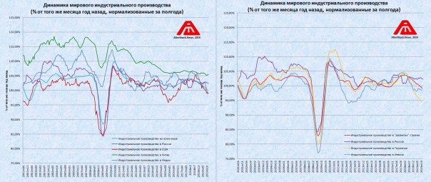 11. Индустриальное производство в процентах от того же месяца предыдущего года с нормализацией за полгода, Россия присутствует на обоих графиках для возможности сравнения, кликабельно: