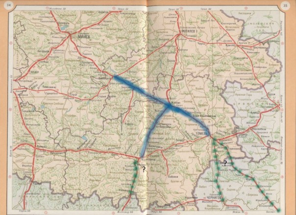Зеленым пунктиром я тогда указал три перспективные линии в сторону Украины. На Чернигов, Бахмач и Коростень. Как выяснилось было выбрано направление на Коростень, самое длинное, но и самое загруженное.
