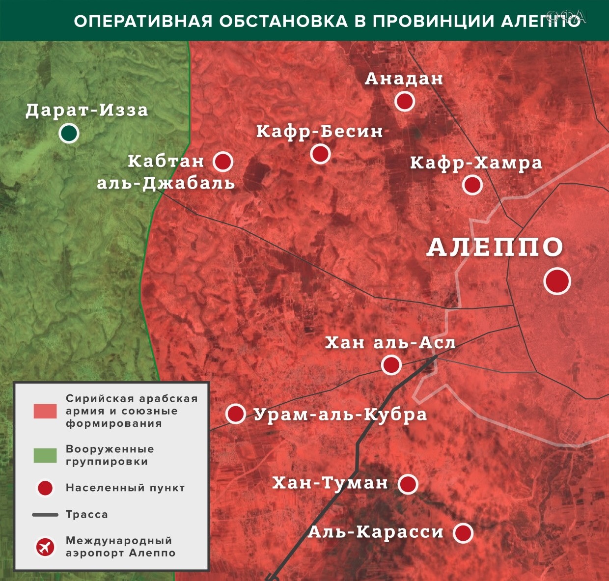 Ожесточенное сражение развернулись возле города Кафр Халяб, где террористы три раза организовывали контратаки. Но несмотря на это 25 дивизия сумела выйти в тыл аллепской группировке войск боевиков, заставив их отойти из пригородов города к турецкой границе.