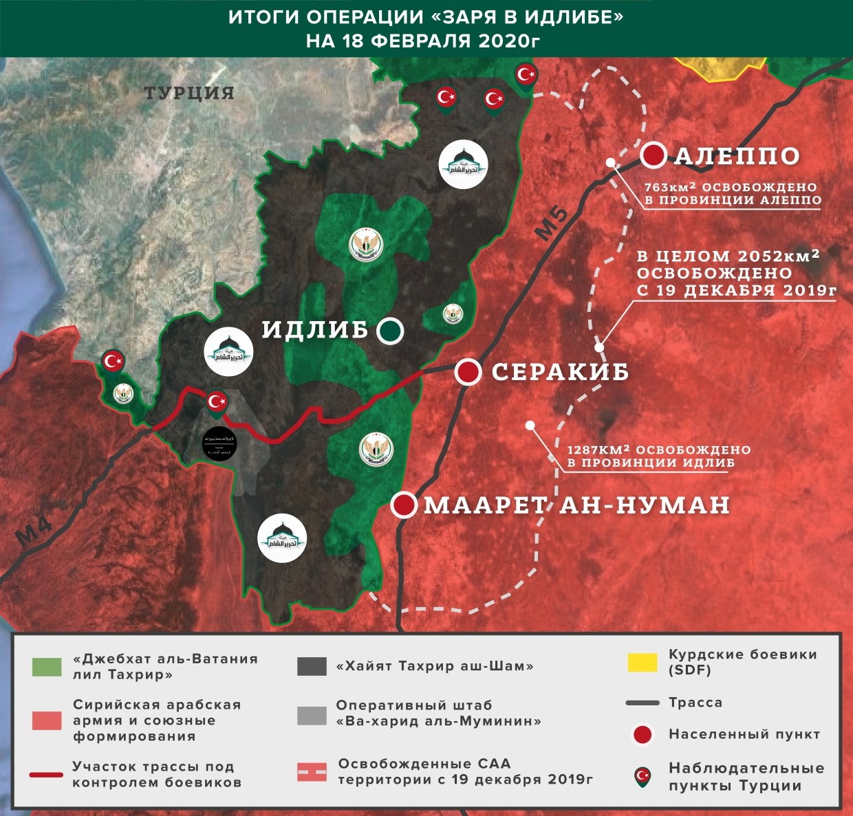 Всего за время проведения второго этапа операции «Заря в Идлибе» с 19 декабря по 17 февраля сирийская армия освободила в Идлибе и Алеппо более 2 тысяч квадратных километров территорий. Среди наиболее значимых побед САА за последнее время можно отметить освобождение городов Маарет ан-Нуман, Серакиб и западных пригородов Алеппо.