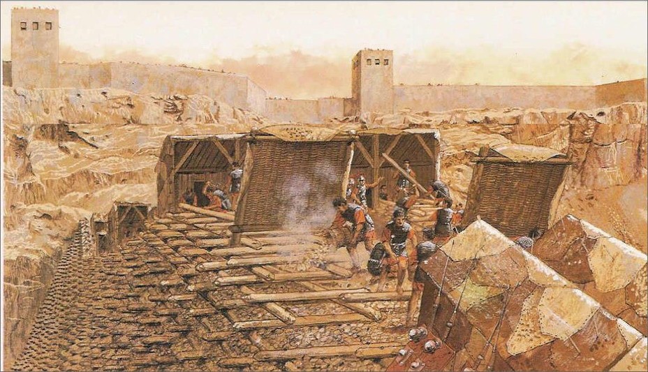 Тем временем работа над валом продолжалась, и он вскоре поднялся вровень с зубцами стен. Тогда по совету Иосифа иудеи ночью надстроили городскую стену до высоты 9 метров. Для ограждения себя во время работы от града неприятельских стрел и камней они создали прикрытие из мокрых шкур.