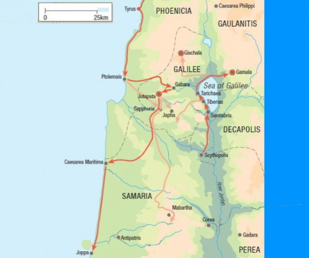 Из Иотапаты римское войско вернулось в Цезарею и 20 дней отдыхало. Затем Веспасиан выступил на Скифополь, а оттуда – в Тибериаду. В городе в это время происходил конфликт между сторонниками римлян и мятежниками, которых возглавлял Иисус бен Сапфия. С приближением римской армии последние оставили город и ушли в Тарихею, расположенную на берегу Генисаретского озера. Ее защитники намеревались дать бой римлянам одновременно на суше и на воде.