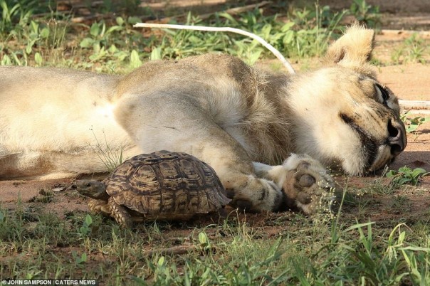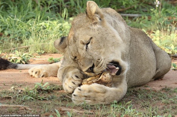 Недавно такая же сцена произошла в Замбийском национальном парке Нижняя Замбези. Львица поймала леопардовую черепаху (Geochelone pardalis), но рептилия вовремя укрылась в своем «домике», а разломать плотный щит кошки не в состоянии.