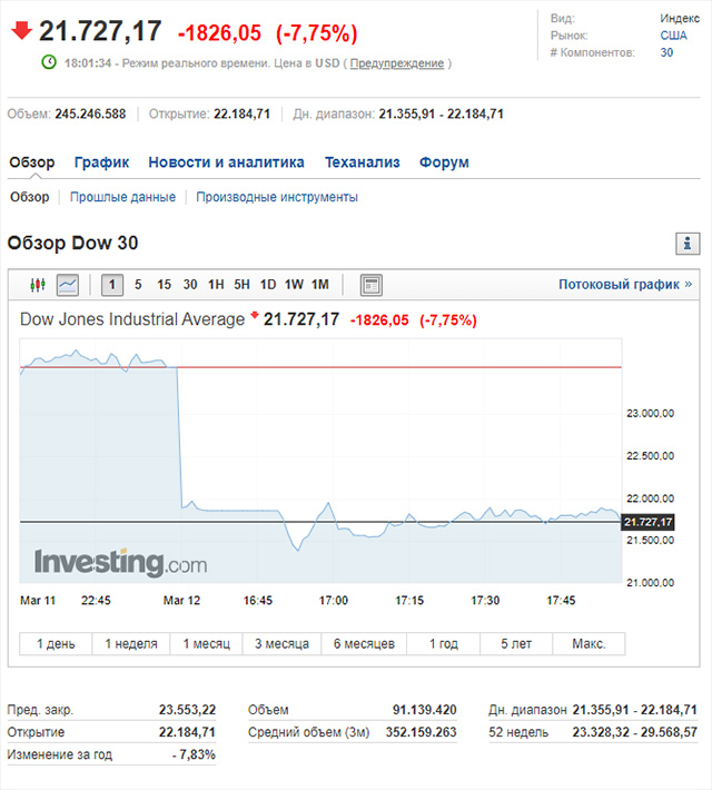 Сегодня, в момент открытия, американские биржи опять обрушились, например индекс Доу-Джонса пробил вниз 22 тысячи пунктов, сразу просев на 7,5%, после чего торги были на некоторое время приостановлены.