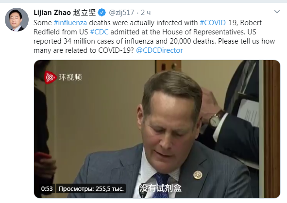 "Минздрав США официально признал, что некоторые из смертей, которые они ранее отнесли к гриппу реально были вызваны коронавирусом. По их официальным данным было 34 миллиона больных гриппом, из которых 20 тысяч умерли. Сообщите нам, будьте добры, сколько конкретно из них это реально коронавирус? Отчет CDC вызывает много вопросов. А когда конкретно был нулевой пациент в США? Сколько именно людей поражено коронавирусом в США? Не армия ли США занесла его в Китай и запустила эпидемию? Будьте прозрачными! Опубликуйте данные! США должны представить нам объяснения!"