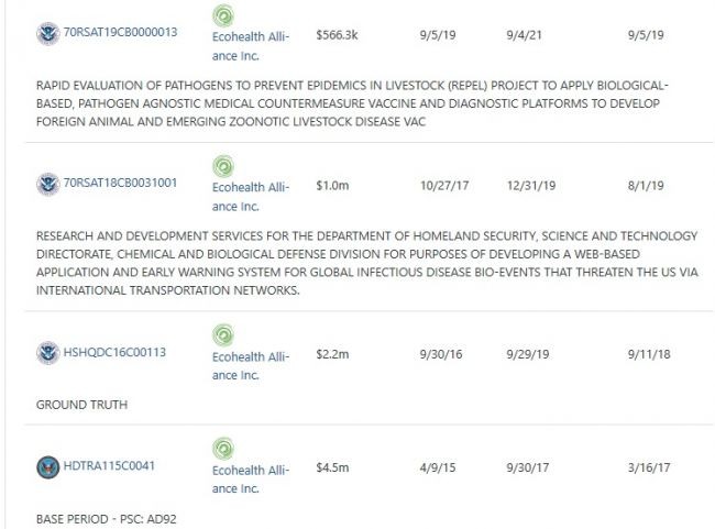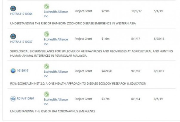 В прошлом году закончился грант на $ 2,9 млн с DTRA на оценку риска появления заболеваний от летучих мышей в Западной Азии. Также в прошлом году специалисты EcoHealth Alliance должны были завершить работы по оценке риска появления коронавируса летучих мышей для Министерства внутренней безопасности США.