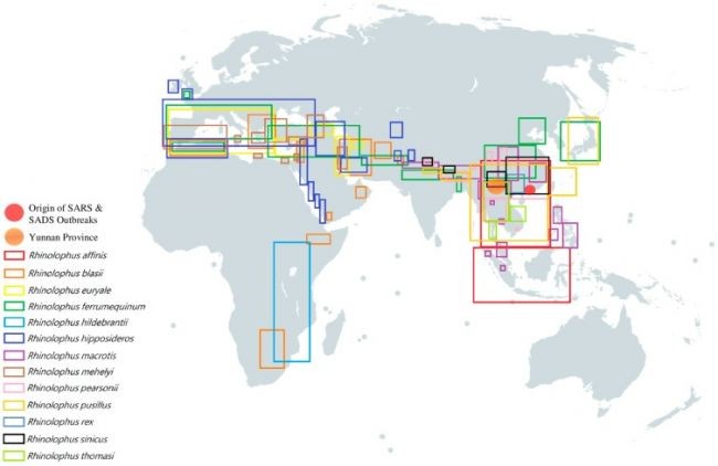 В другой работе сотрудники департамента микробиологии, лаборатории зарождающихся инфекционных заболеваний и исследовательского центра инфекции и иммунологии Университета Гонконга опубликовали карту географического распространения различных подковоносых летучих мышей, которые переносят различные коронавирусы. И она полностью соответствует тому, где зафиксировали в начале распространения самые сильные вспышки COVID-19 в Евразии: Китай, Южная Корея, Япония, Иран, Италия и Испания.