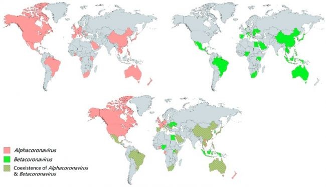 Любопытно, что еще на одной карте ученые из Гонконга указали страны, которые ранее сообщали о случаях коронавируса летучих мышей — альфакоронавирусах и бетакоронавирусах. И в Евразии они снова пришлись на те страны, которые приняли самый первый и самый сильный удар COVID-19.