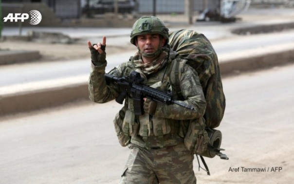 Турецкий военнослужащий оккупационных войск на северо-западе Сирии, в городе Атареб, показывает фотографу AFP знак Серых Волков. Серые Волки - открыто фашистское турецкое ультранационалистическое движение в Турции, относящееся с глубокой расовой ненавистью к курдам. 19 февраля 2020