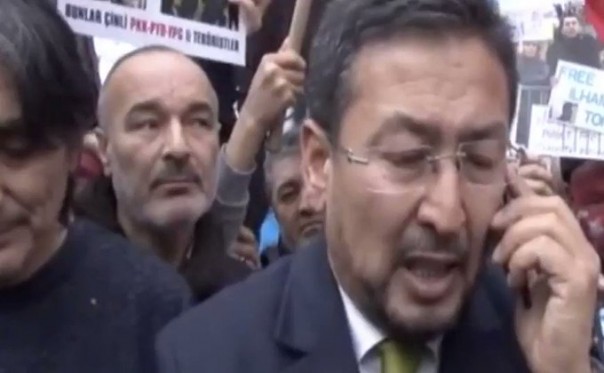 Сейит Тюмтюрк, уйгурский лидер в Турции, говорит по телефону с министром внутренних дел Турции Сулейманом Сойлу перед проведением митинга у посольства Китая в Анкаре. Он говорит, что уйгуры рассматривают обращения властей Турции как приказы и после разговора ведет митинг к парку Кугулу. 6 декабря 2018