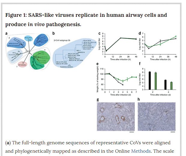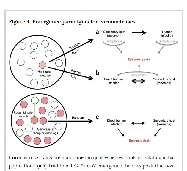 «Во время эпидемии коронавируса SARS были установлены связи между циветами и штаммами CoV, которые были обнаружены у людей. Основываясь на этом открытии, общая парадигма перехода (вируса к человеку) показывает, что эпидемия SARS-CoV возникла как вирус летучей мыши, перешла к циветам и произвела изменения в рецептор-связывающий домен (RBD) для улучшения связывания с циветой Ace2. Последующее воздействие на людей на рынках живых животных позволило человеку заразиться штаммом циветы, который, в свою очередь, стал эпидемическим штаммом. Тем не менее филогенетический анализ показывает, что ранние человеческие штаммы SARS более тесно связаны со штаммами летучих мышей, чем со штаммами циветы 18. Поэтому вторая парадигма утверждает, что прямая передача от летучей мыши человеку инициировала появление SARS-CoV и что циветы служили вторичным хозяином и резервуаром для продолжающейся инфекции». И ещё один сногсшибательный вывод: