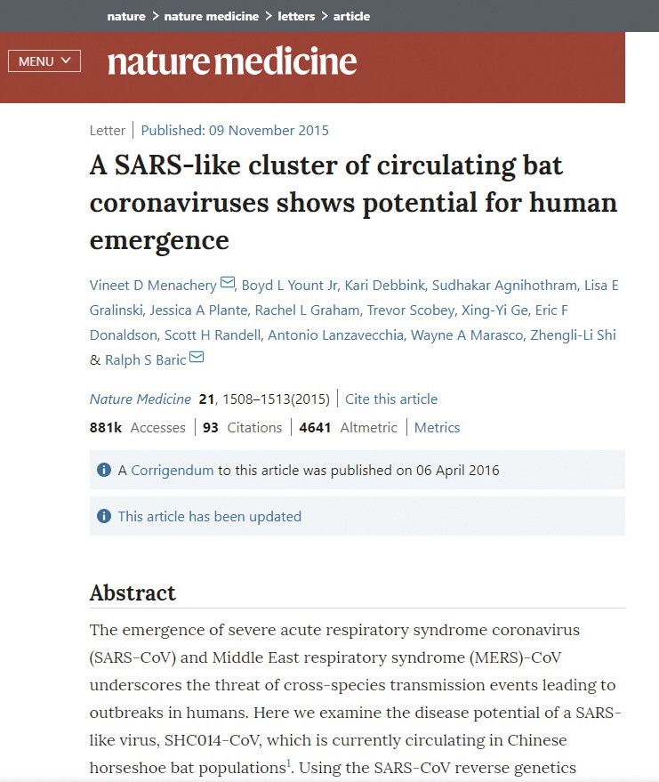 ПРОИЗОШЛО это ещё в 2015 г. или даже ранее. Во всяком случае статья о проведённых научных исследованиях была официально опубликована 9 ноября 2015 г. в научном журнале Nature. Оригинальное название материала: A SARS-like cluster of circulating bat coronaviruses shows potential for human emergence. В переводе на русский это звучит так: «SARS-подобная группа коронавирусов летучих мышей демонстрирует потенциал к переходу на человека». Так что проверить данную информацию на сайте журнала пока ещё может каждый. Эту большую по объёму статью я детально разобрал, в ней очень много специализированных научных терминов, поэтому вкратце расскажу, о чём в ней говорится.