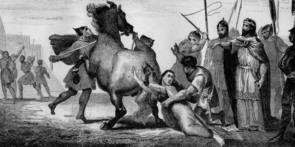 Дело кончилось тем, что королева, даже в старости не потерявшая боевого задора, попала в плен к Хлотарю, сыну Фредегонды. Тот обвинил её в смерти десяти членов королевской семьи. В этот перечень попали и те, кого загубила Фредегонда, — Хлотарь решил списать все проблемы одним махом. Семидесятилетнюю Брунгильду привязали к хвосту коня и отправили того вскачь.