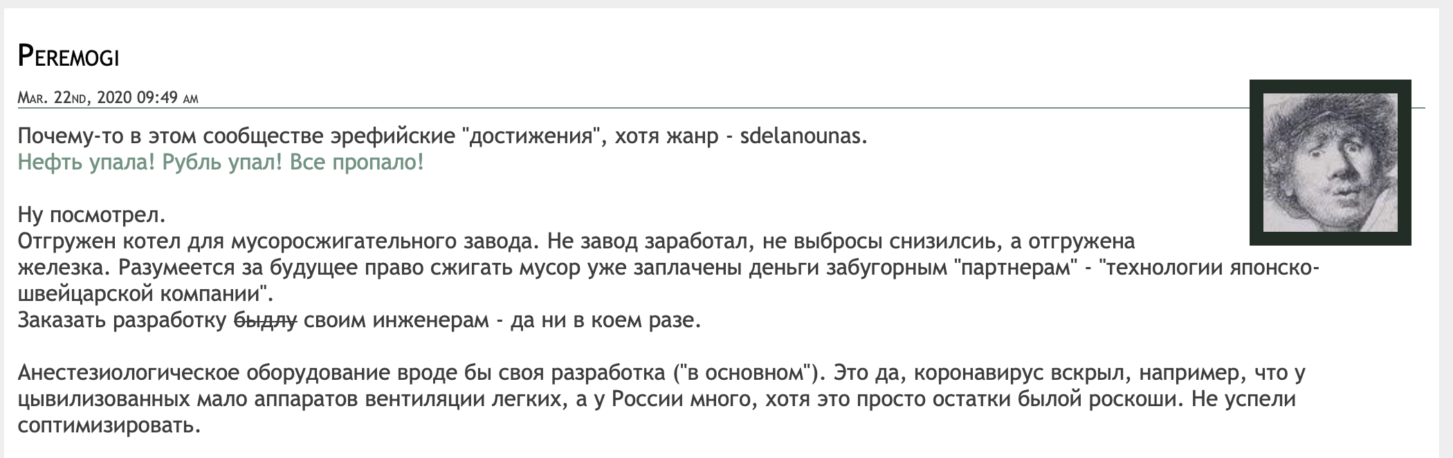 Это был первый удар поварешкой по кастрюльке. Теперь про "в России много аппаратов ИВЛ, и все это остатки былой роскоши". Не признать, что в России их реально в достатке (в одной только Москве, как во всей Италии) свидомые и наши оппозиционеры не могут, приходится гадить про "былую роскошь".