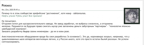 Внезапно! в Екатеринбурге аж три производителя. И им будут заказаны еще 500 аппаратов ИВЛ для регионов, в дополнение к 40.000 уже имеющихся. Причем без конкурса и сразу. При этом Великобритания вынуждена просить приступить к разработке таких аппаратов своих авиа и авто производителей. Ну вы понимаете примерно перспективы перехода на такое сугубо медицинское, глубоко специализированное оборудование. При том, что сейчас даже олигархи ищут по всему миру аппараты ИВЛ, стоящие порядка 1,8 млн рублей, но очередь у производителей на 8 месяцев.