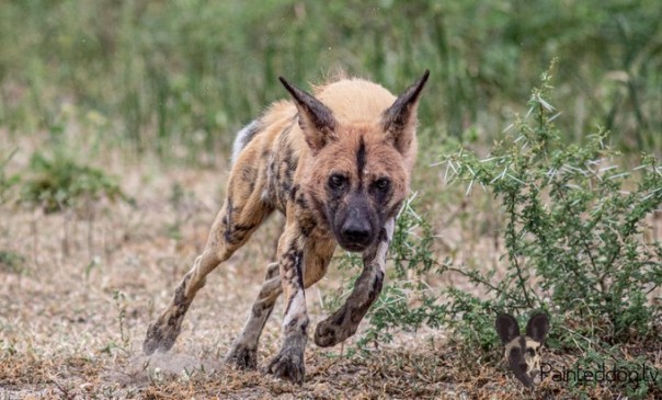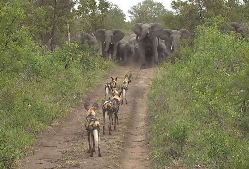 Гид, фотограф и любитель природы Брент Лео-Смит следовал на джипе за стаей гиеновидных собак (Lycaon pictus). В какой-то момент они почти столкнулись со стадом слонов, которые двигались по дороге с противоположной стороны.