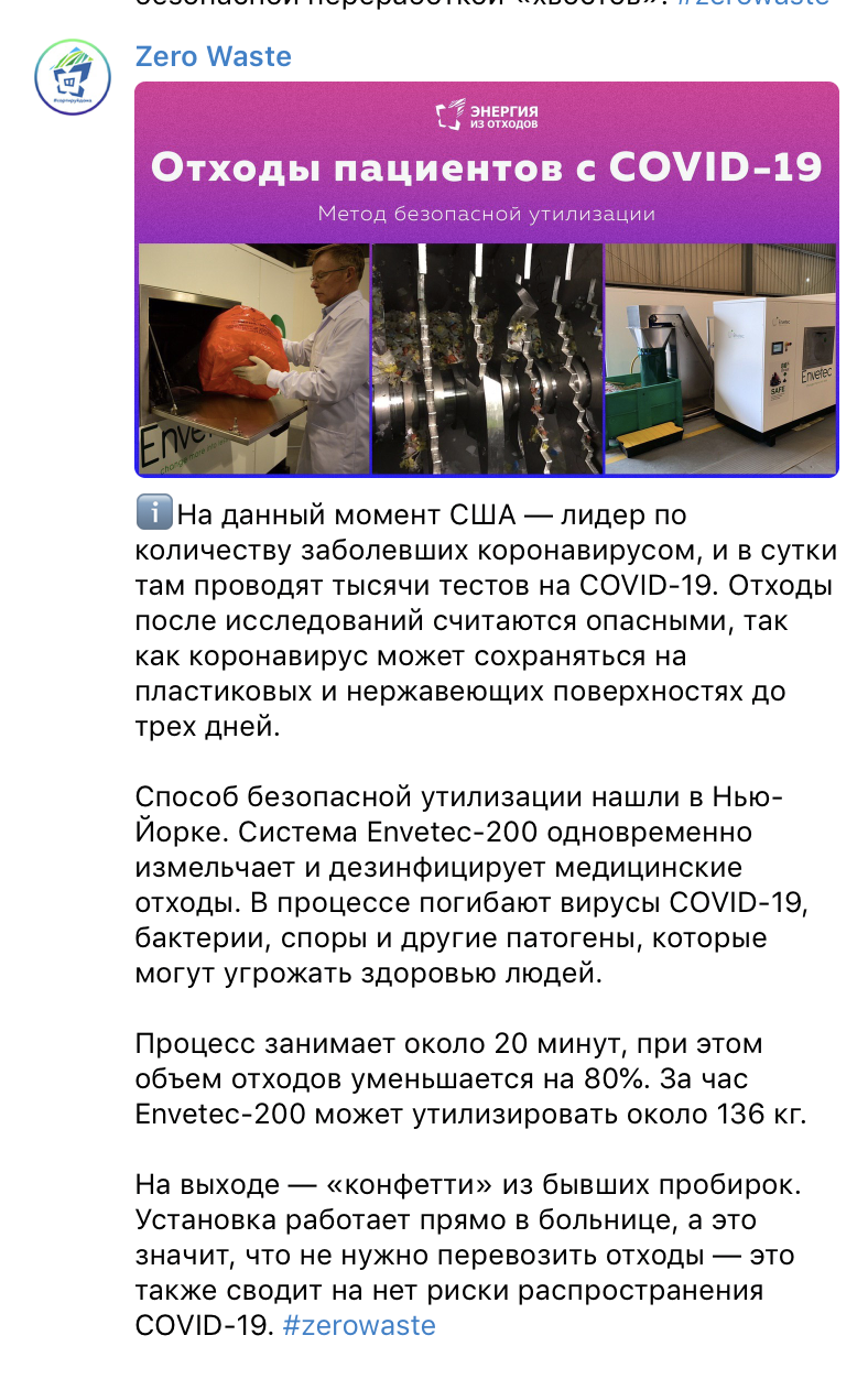 Объективно, у нас на глазах появляется целая отрасль, старт которой дал коронавирус. Перевод мощностей на производство масок этот так, сдача бутылок. Процессы будут куда масштабнее. Ранее уже писал про выросшую нагрузку на заводы по термической переработке мусора в Европе, они сейчас жгут отходы по максимуму. У нас, к сожалению, такой возможности пока нет. Вот уж не думал, когда начинал писать о переработке отходов, что здесь могут быть другие смыслы, кроме вторпереработки (бумага, металл, пластик, стекло) и выработки энергии. Могут, и уничтожение опасных отходов, которых не было, но вдруг! - один из.