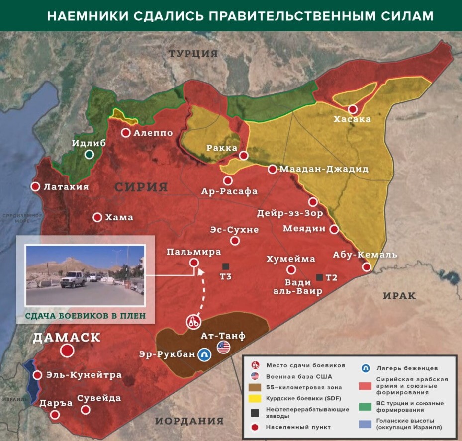 Сирийские офицеры создали все условия для выхода боевиков незаконных вооруженных формирований «Джейш Магавир ат-Таура» с территории вокруг базы «Ат-Танф», подконтрольной США. 28 боевиков вышли из оккупированной зоны в район Пальмиры, они сдали свое снаряжение, оружие и технику Сирийской Арабской Армии.