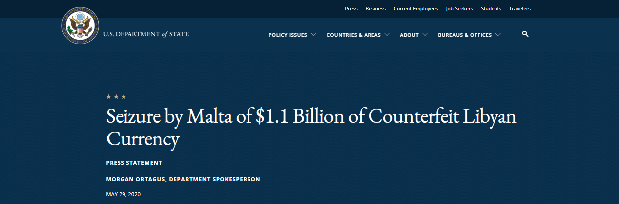 "Соединенные Штаты приветствуют объявление правительством Республики Мальта 26 мая об изъятии контрафактной ливийской валюты на сумму 1,1 млрд. долл. США, напечатанной акционерным обществом «Гознак» - российской государственной компанией, - и заказанной нелегитимной параллельной организацией.