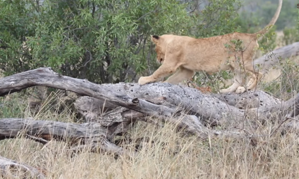 Упавшее дерево лежало поперек другого, и когда львенок добрался до середины ствола, тот под его весом покачнулся и опустился на другую сторону противоположным концом к земле. Сперва львят это напугало, и они бросились врассыпную, но вскоре любопытство взяло верх.