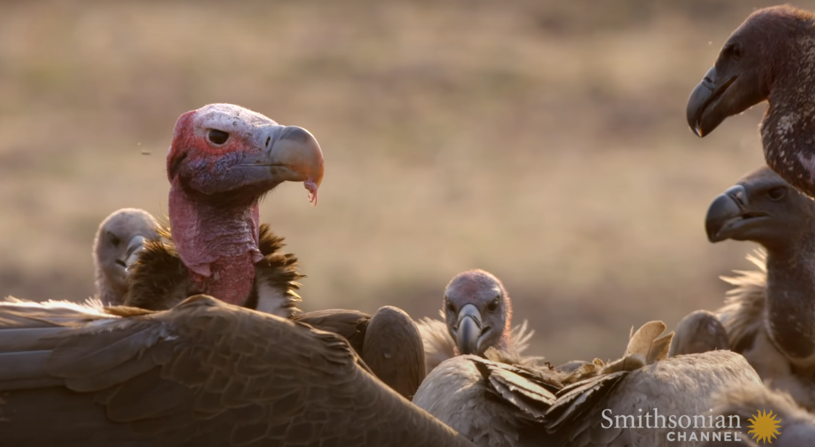 Драки вспыхивают одна за другой; ушастые грифы налетают на ушастых, а африканские воюют против африканских. Однако в итоге пищи хватает всем. Некоторые птицы, насытившись, сидят на земле, устало свесив головы вниз.