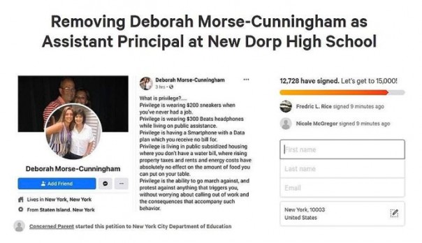 Петиция официально была создана «заинтересованным родителем», который и призвал отстранить Дебору от должности в средней школе Нью-Дорпа. В действительности автор петиции – американка Эвелин Боргоно. Вот что написано по этому поводу на её странице в Facebook: «Дебора Морс-Каннингем – помощник директора средней школы Нью-Дорп в Стейтен-Айленде, Нью-Йорк.
