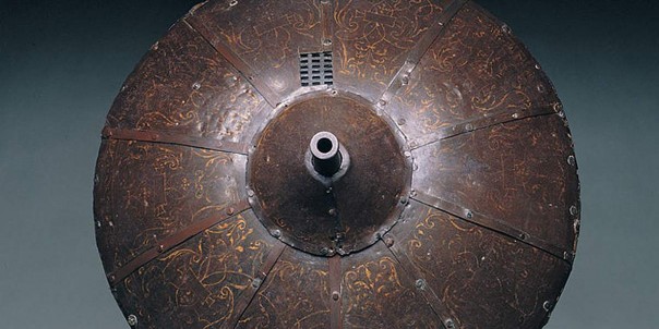 Круглый деревянный щит был обит сталью. Из центра торчало пистолетное дуло. Предполагалось, что охранник, держа пистолет за ручку, будет целиться в неприятеля, а щит тем временем прикроет охранницкое тело.