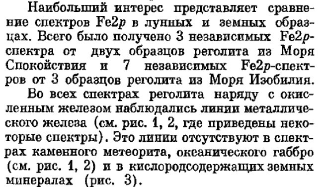 Работа посвящена так называемому "неокисляемому железу" на поверхности частиц лунного реголита: во всех образцах (и в советских, и американских) было обнаружено металлическое железо, которого нет в метеоритах и земных породах.