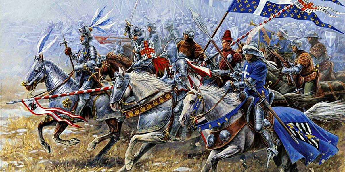 Вообще обращения к святым — одна из основных тем средневековых боевых кличей. Англичане взывали к Святому Георгию, испанцы — к Сантьяго, то есть Святому апостолу Иакову, бургундцы — к Сен-Андре.