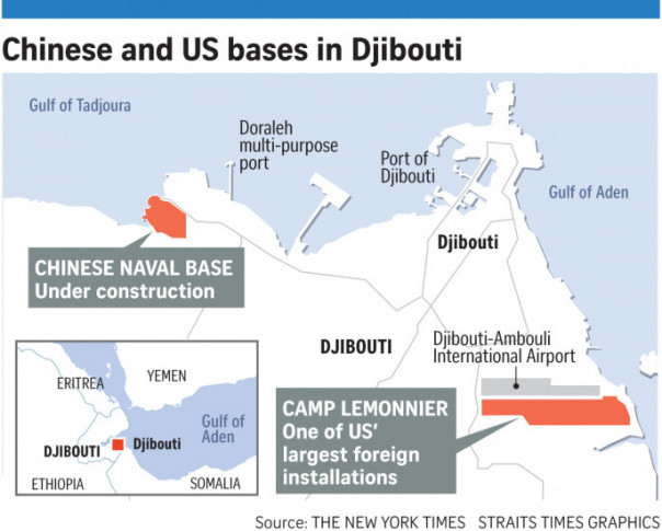 Джибути имеет важное геостратегическое расположение, поэтому там размещены не только китайские, но и американские, японские, французские, немецкие, итальянские, испанские, саудовские военные контингенты. У США в Джибути имеется крупнейшая в Африке военная база - «Кэмп - Лемонье» (5 тысяч военнослужащих). Китайская военная база в Джибути располагает 10 тысячами военнослужащих.