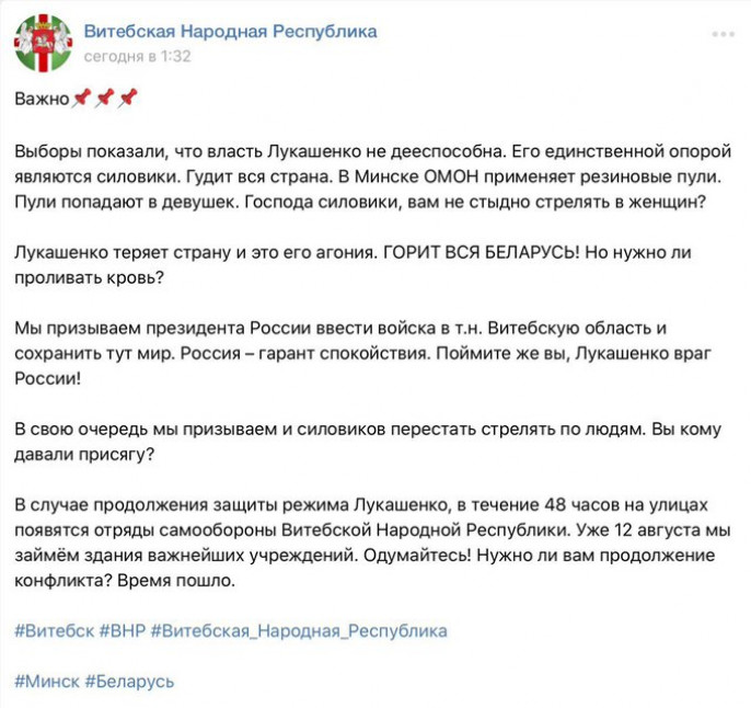 Авторы текста говорят об "агонии Лукашенко" ("Горит вся Беларусь!"), призывают "президента России ввести войска в т. н. Витебскую область" и угрожают: "В случае продолжения защиты режима Лукашенко, в течение 48 часов на улицах появятся отряды самообороны Витебской Народной Республики. Уже 12 августа мы займём здания важнейших учреждений". О как.
