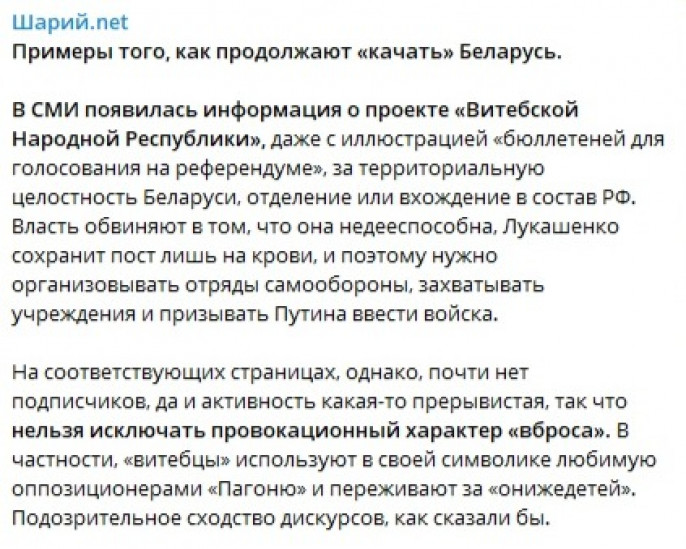 Именно СМИ Незалежной первыми начали форсить тему "ВНР". Издание "Главред" сообщило: "Активизировалось движение за создание Витебской народной республики". Тамошний горе-политолог Виктор Таран, председатель аналитического центра "Эйдос" и Общественного совета при Национальном агентстве по предупреждению коррупции, моментально заявил: "Россия активно включилась в дестабилизацию ситуации в Беларуси. Встречайте Витебскую Народную Республику. Активно распространяет призывы к Путину ввести войска в Беларусь. Угрожает, что в течение 48 часов на улицах города появятся отряды самообороны. Анонсирует захват госучреждений. Активно готовит референдум по вхождению региона в состав России. Ничего не напоминает? ВНР — детище ФСБ, а Россия готовится к полномасштабному вторжению. Очень внимательно следим за событиями в Беларуси и Витебской Народной Республике". Примерно о том же завопил Сергей Высоцкий, функционер порошенковской партии "Европейская солидарность". И московский либерал Леонид Гозман (на "Дожде") с ними в унисон: "Я боюсь, что Путин введёт войска и аннексирует Беларусь". И другой московский либерал (журналист, ВИЧ-инфицированный гей, манерный пиарщик с опытом работы в штабах олигарха Прохорова и Ксюши Собчак), мимоходом: "Я бы уже сейчас вводил войска".