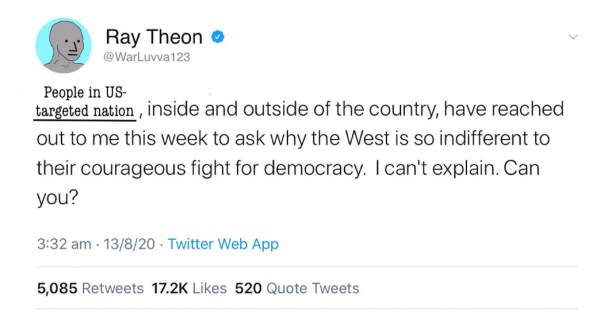 Давайте для упрощения понимания приведём пост Макфола в его исходный вид согласно типовому образцу: «Люди из страны, оказавшейся под прицелом США, находящиеся на территории и за пределами государства, обратились ко мне на этой неделе с вопросом о том, почему Запад так безразличен к их отважной борьбе за демократию. Я не могу объяснить, почему. А вы можете?».