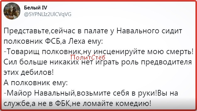 «Они охерели с Навальным. Шоу, конечно, „маст гоу ан“, но не до такой степени. В одной машине едет больной. Во второй что, анастезиолог? В третей кардиолог? В четвёртой нарколог? Ещё и полицейский эскорт? Это что за шоу? Он что в животе привёз флешку с секретными данными? Это такая спецоперация?»