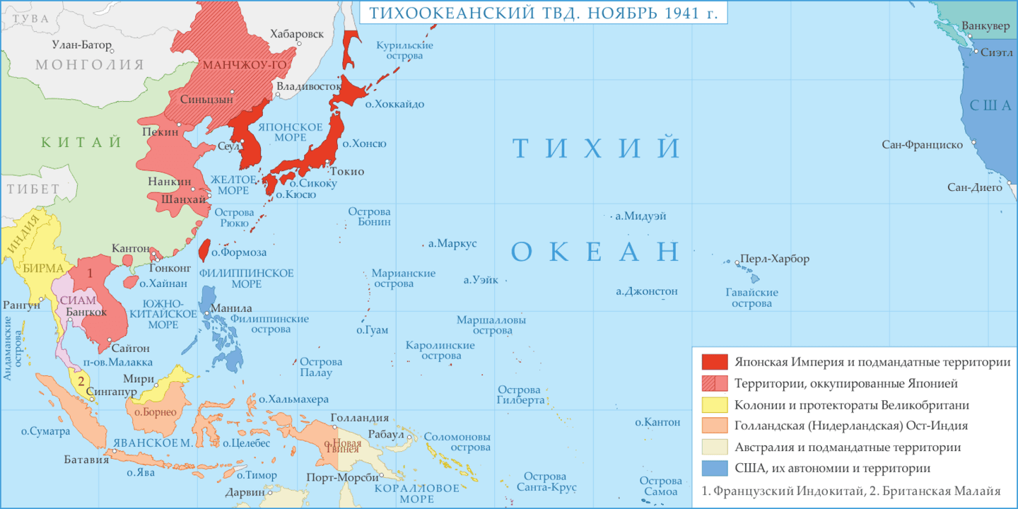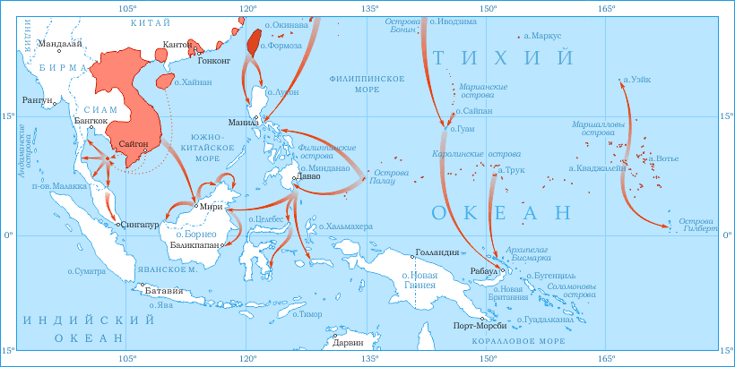 На самом деле этот вопрос можно даже расширить: «А зачем японцы вообще связались со Штатами?» Ведь у Японии в новой войне были две вполне конкретные и понятные цели: прикрыть последний канал внешнего снабжения китайской армии через Британскую Бирму и отжать ресурсы — прежде всего нефть — Голландской Ост-Индии. А принадлежавшие тогда США Филиппины их совершенно не интересовали. Проблема была в географии.