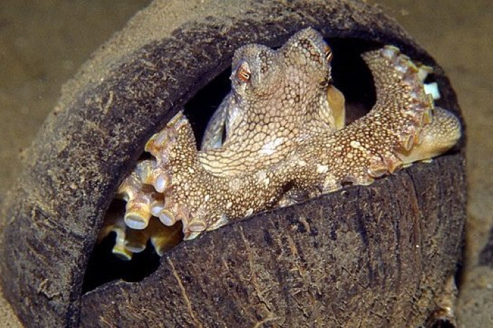 Некоторые осьминоги используют скорлупу кокосового ореха, чтобы укрыться от врагов.